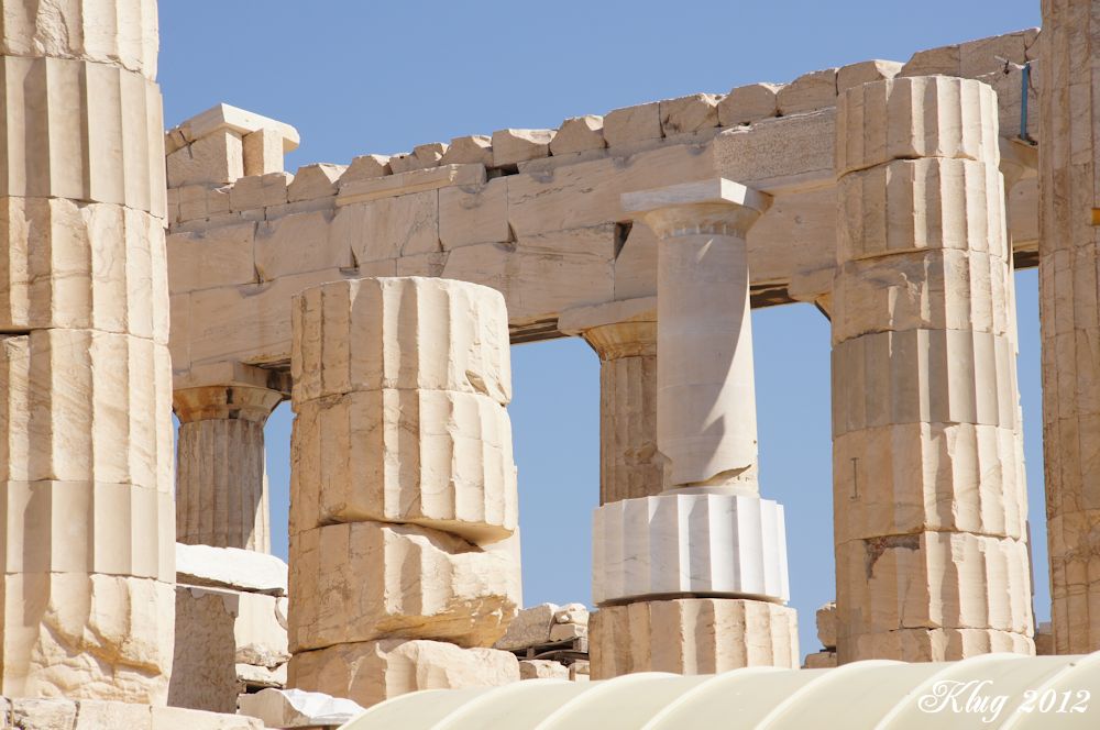 Athens, GREECE by way of the Port of Pireaus Saturday, 24 March What a glorious morning when we arrived in Piraeus, Greece. The temperature forecast was 66 degrees and it was perfect! Off the ship bright and early we met our guide Anna Benaki. She was waiting outside the terminal with a large mini bus and driver for our day long excursion. She told us we might have asked someone else to join, so she wanted to be prepared! Same cost - no problem. The four of us instantly knew she was the right guide for us! Anna planned the day starting at the Acropolis when we are all rested and before the heat rises. While it was in the 60's it was warm on top of the hill.