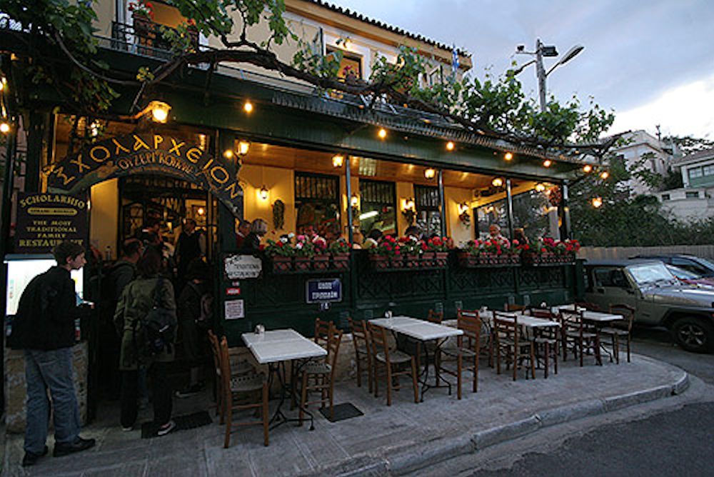 After a very busy morning and early afternoon we were all ready for lunch. We headed back to the Plaka to Anna's favorite restaurant, Scholarhio on Tripodon. What a wonderful meal. The restaurant is a traditional family style place. For a price per person, they bring out all 18 Greek specialty dishes they have on a platter that would fit two tables. You get to select the dishes you want and the number depends on how many in your group. So for five of us we chose 12 dishes. The meal also included water, bread, ouzo, and house wine. We sat on the porch and could watch the people walking up and down the street. We enjoyed the meal so much that we forgot to take any pictures. I did copy a picture from the Scholarhio website and it is below with the restaurant card. If you ever go to Athens, make sure you go there for lunch or dinner. You won't be disappointed!