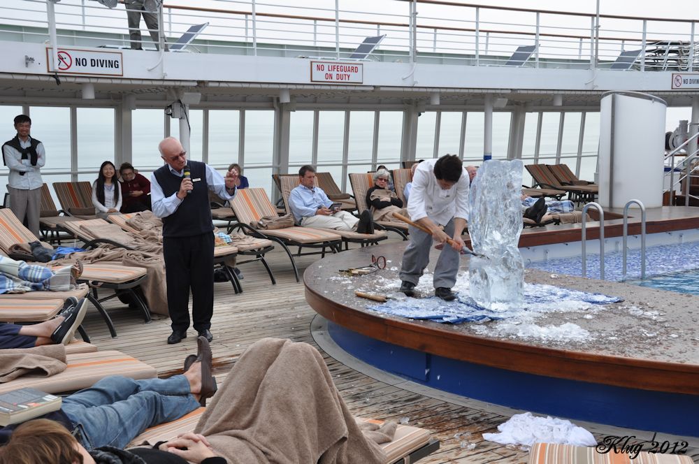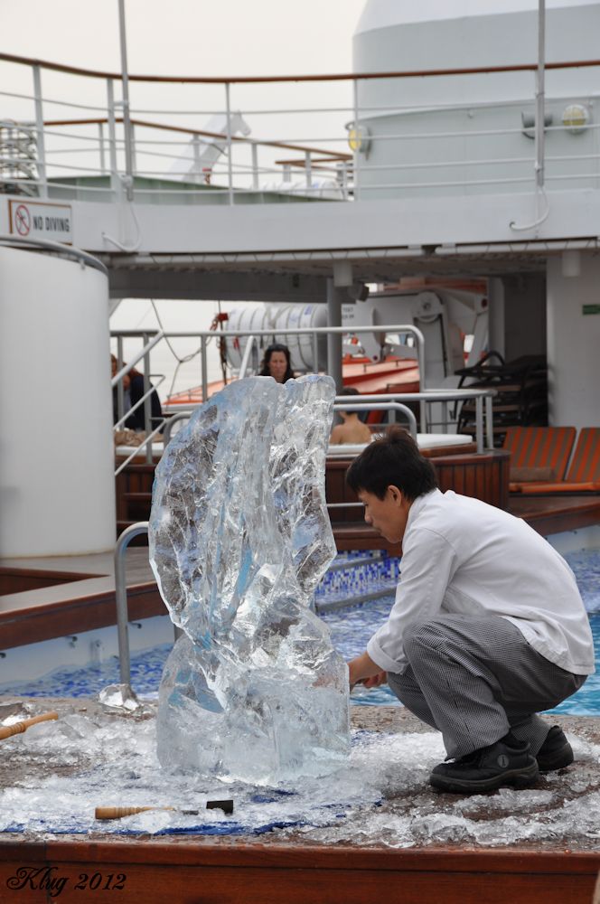 Sea Day Friday, 23 March After a long series of port days and lots of adventures, we had a "rest day". Carey had a massage and Randy went on the Navigational Bridge tour conducted by the Captain and the First Officer. He really enjoyed seeing the inner workings of the bridge while Carey snoozed on the massage table! After lunch we went to the Ice Carving demonstration on the pool deck. It was not very warm outside so it was actually a great time to carve on the pool deck. It was interesting to watch the block of ice become an eagle through the vision and hands of the carver. After that we played in the Blackjack tournament. Carey took second place! Woo Hoo!
