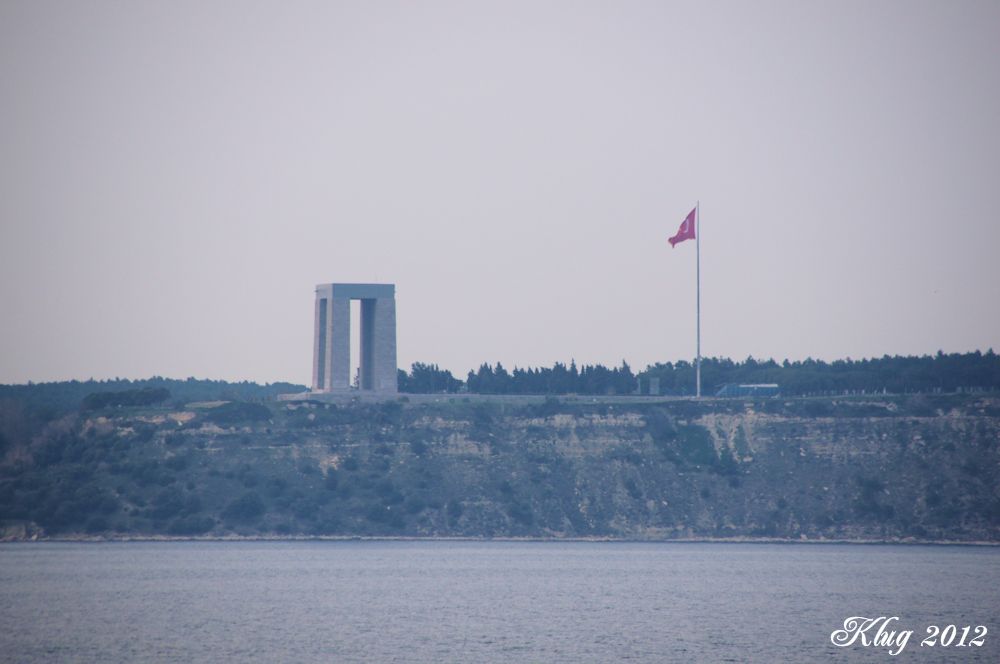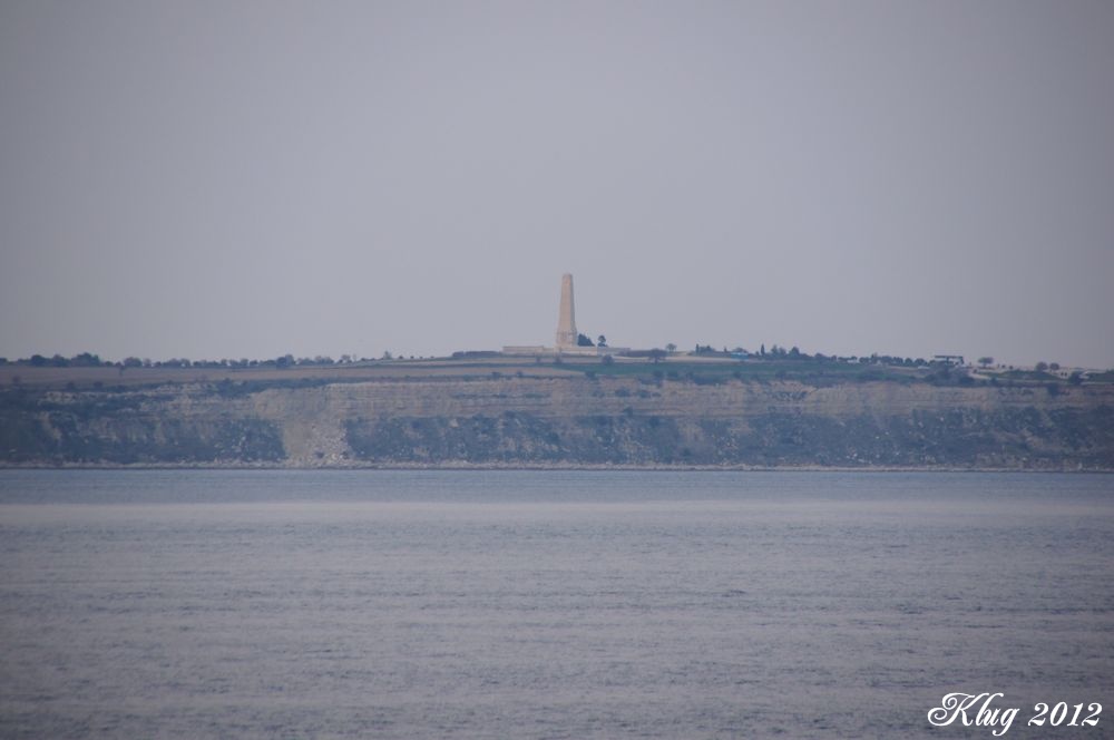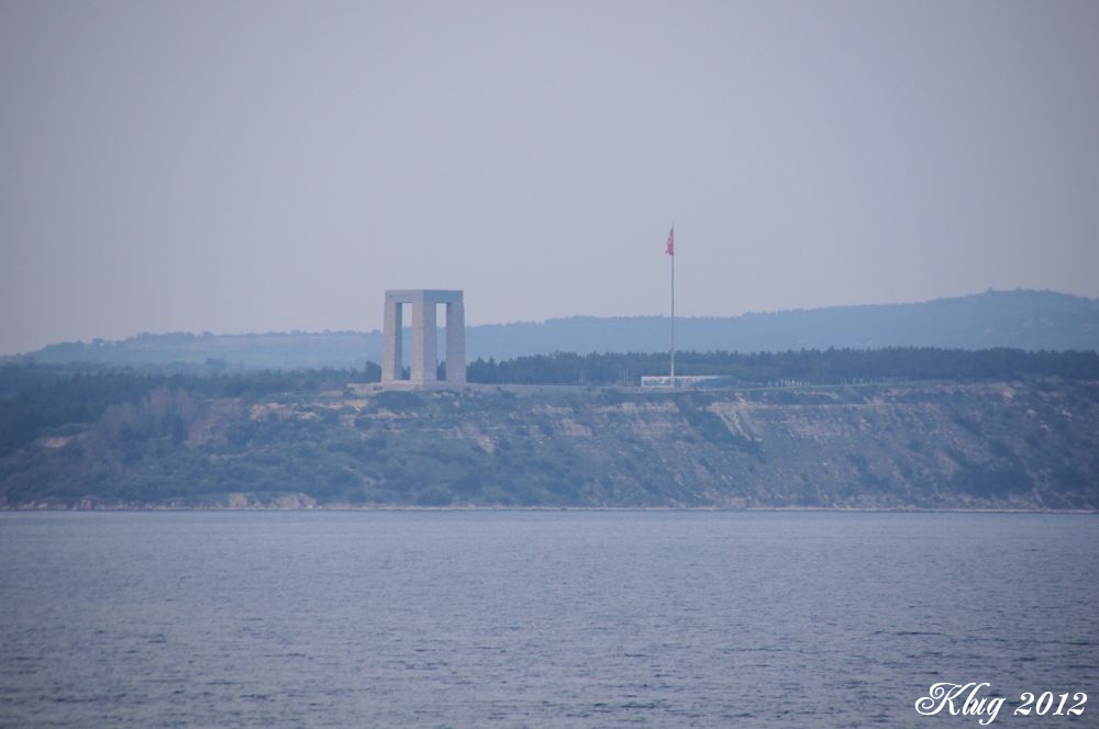 Day at Sea Sunday, 25 March Our last day at sea we relaxed some and also did the majority of the packing in preparation for leaving the ship in Istanbul. During the day we wandered the ship, played in the second blackjack tournament (this time neither of us placed in the money), and enjoyed our last formal dinner and dance. In the evening, before dinner, we passed through the Dardanelles and passed by Gallipoli. The cruise director and historian took this one time in our cruise to actually broadcast key points of the Battle of Gallipoli and the history of the area as we passed through the straits. The following link has very interesting information on the Turkish memorials and links to other sites "Visiting Gallipoli Today" Although it was a bit hazy in the evening we were able to take a few pictures of the primary memorials visible from the ship.