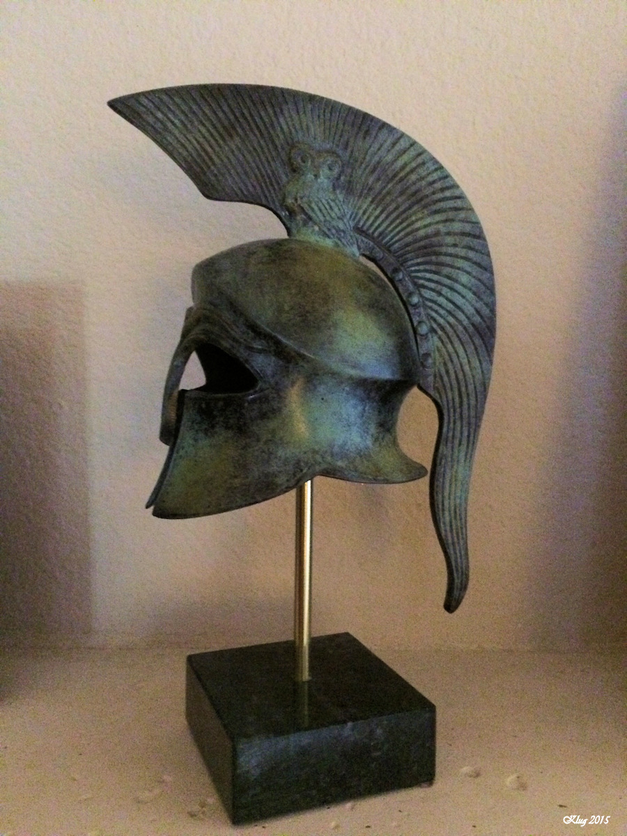 Katakolon, Greece 15 June 2015 - As planned this port was a slow morning, wander off for a couple of hours around the very tiny "town"of Katakolon, and just relax. There are three or four ships in port and most all of the cruisers were off to Olympia. As it was another hot, and windy day we were glad we had visited last year on a perfectly pleasant day! We located the post office to mail some postcards and looked in some of the shops. We saw bronze helmets which we thought we might add to our collection of treasures. One store had reasonable prices, but the more we looked at the pieces, the less well made they seemed. Wander a bit more (like one more street!) and we see a gallery, with bronzes and other pieces. Quite a few cruisers from the Spirit were in the small shop and we'de found the higher quality works! After searching we finally settled on a bronze helmet with the Owl of Athena. It is handmade by the artist Kosta Semitekolo. He uses the lost wax technique and applies a ptina to give the look and feel of an antique helmet. Each piece is one of a kind. If you ever visit Katakolon stop by the Greek Art Gallery. Their website is www.olympiart.com and I see you can order direct from them.