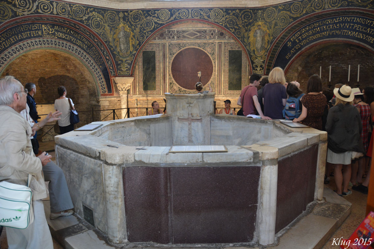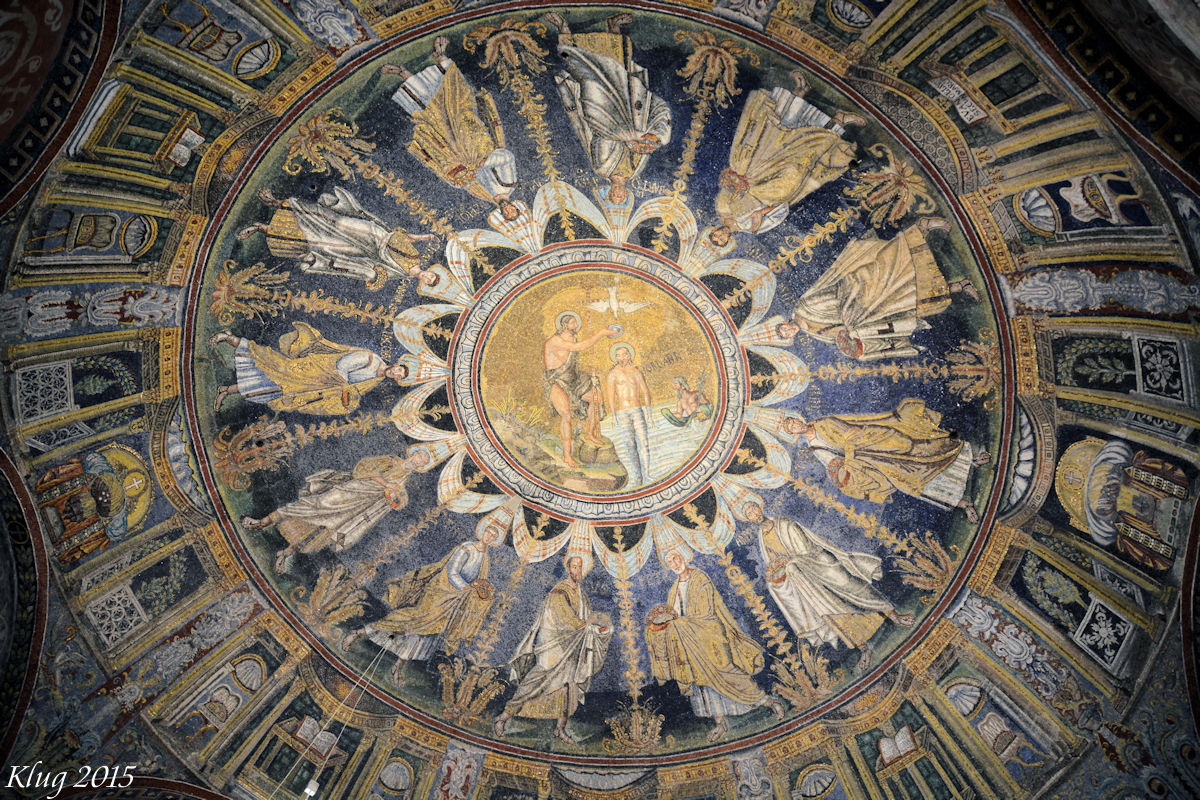 Battistero Neoniano (Battistero Degli Ortodossi) - The octagonal brick structure was erected by Bishop Ursus at the end of the 4th or beginning of the 5th century, as part of his great Basilica(destroyed in 1734). The baptistery was finished by Bishop Neon at the end of the 5th century, at which time the mosaic decorations were added. The original floor is now some 3 meters underground, so the proper structure and extent of the building can no longer be seen. The octagonal design of the building, employed in virtually all Early Christian baptisteries, symbolizes the seven days of the week plus the Day of the Resurrection and Eternal Life. The ceiling mosaic depicts John the Baptistbaptizing Jesus(depicted with beard) standing waist high in the Jordan River. To one side stands the personification of the Jordan river, with a reed in one hand and a garment in the other. A procession of the twelve apostles proceeds around the center mosaic in two directions, ending with Saint Peter meeting Saint Paul. The Baptistry is one of the eight structures in Ravenna registered as UNESCO World Heritage Sites. According to the ICOMOS evaluation of this patrimony, "this is the finest and most complete surviving example of the early Christian baptistry" which "retains the fluidity in representation of the human figure derived from Greco-Roman art".