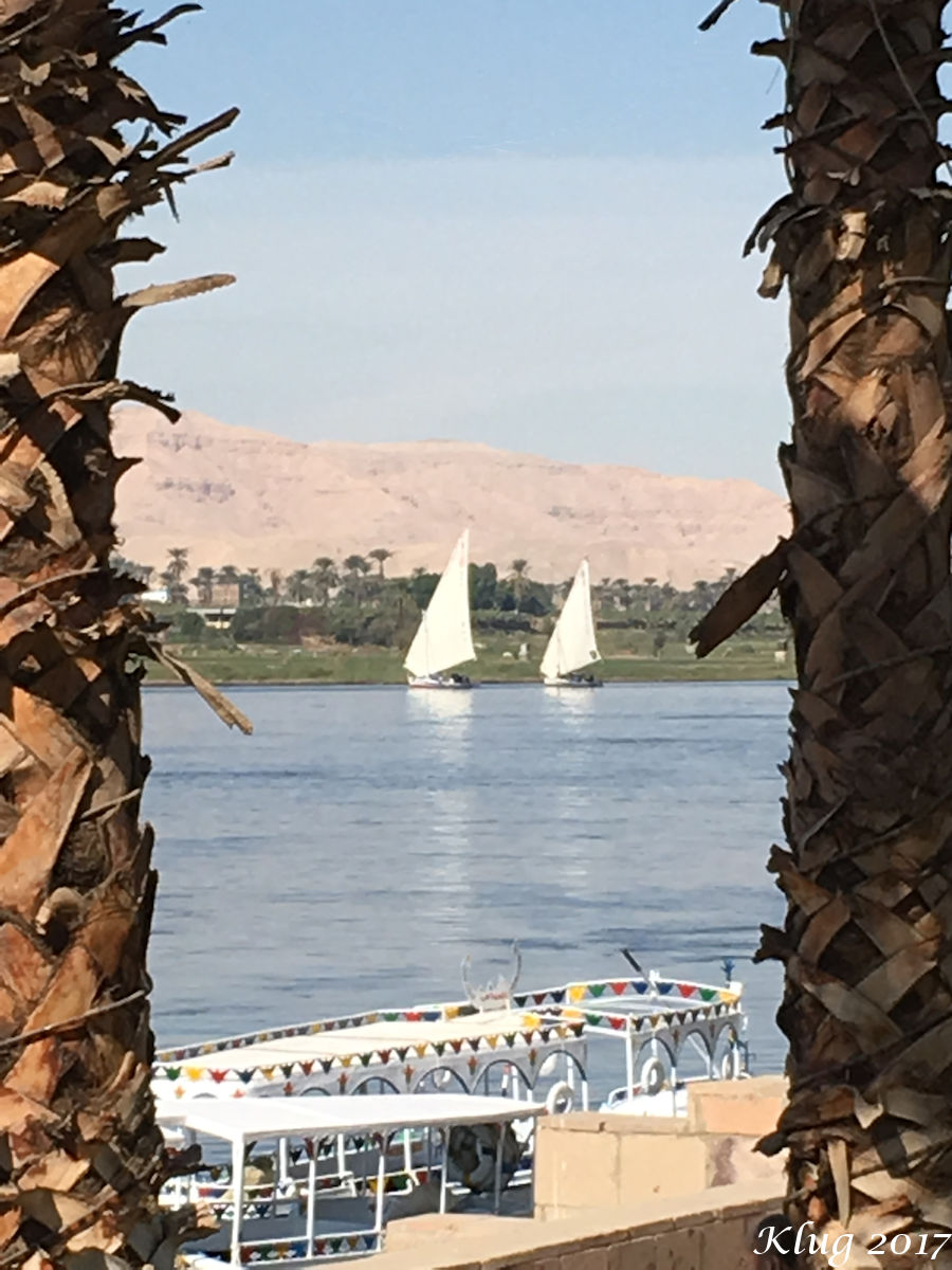 After the short stop visiting the Colossi, our bus returned to Luxor and a small hotel on the Nile River for afternoon tea. It was a lovely place to rest and refresh before the long drive back to the ship. During our stop the sun began to set and we saw a beautiful sunset with Nile RIver and the Valley of the Kings as our backdrop.