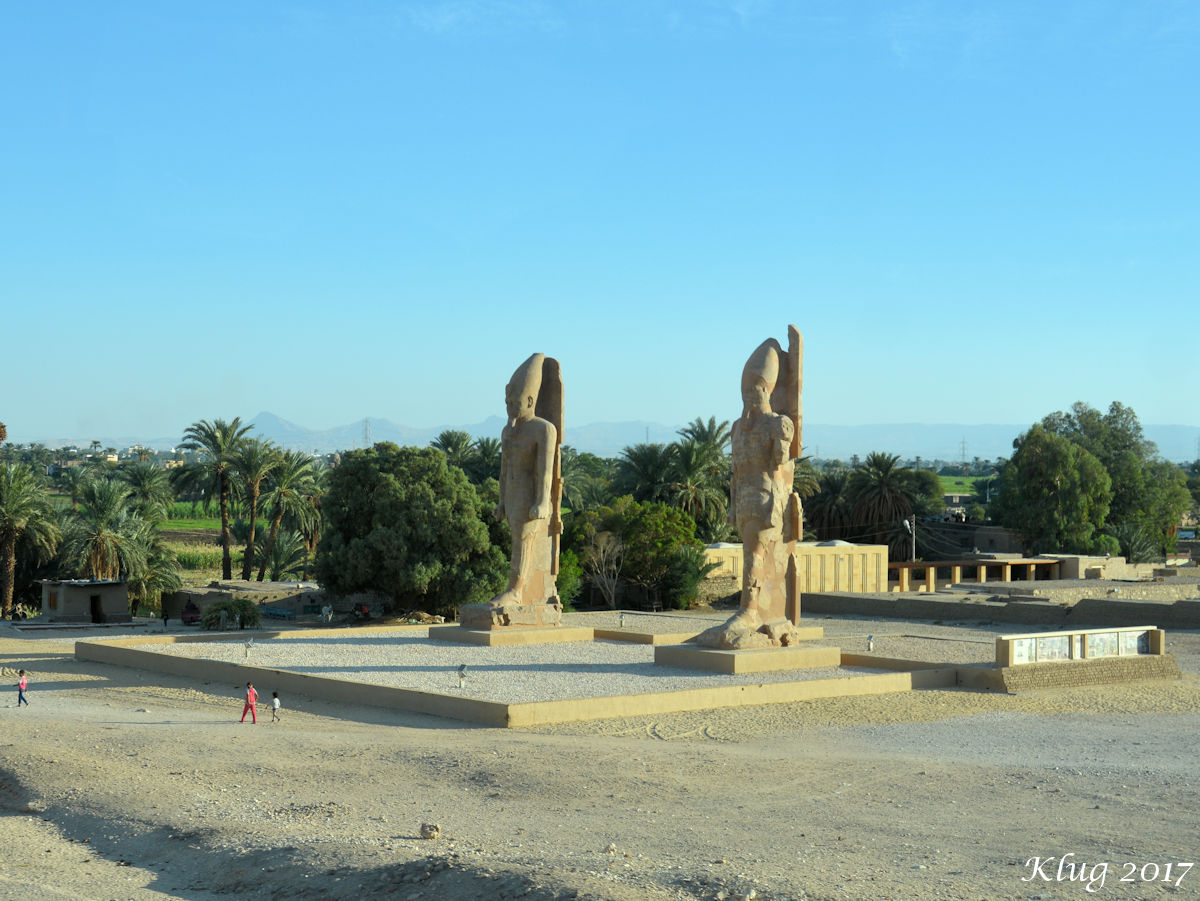 Colossi of Memnon After we departed the temple we drove back through the Theban Necropolis, past what we now know were numerous mortuary temples and sites for various pharoahs. The map below is from wikipedia.org So reading more about the Colossi I found the best simple description to be on wikipedia - "The Colossi of Memnon are two massive stone statues of the Pharaoh Amenhotep III, who reigned in Egypt during the Dynasty XVIII. For the past 3,400 years (since 1350 BC), they have stood in the Theban Necropolis, located west of the River Nile from the modern city of Luxor. Both statues are quite damaged, with the features above the waist virtually unrecognizable. The southern statue comprises a single piece of stone, but the northern figure has a large extensive crack in the lower half and above the waist consists of 5 tiers of stone. These upper levels consist of a different type of sandstone, and are the result of a later (Roman Empire) reconstruction attempt. It is believed that originally the two statues were identical to each other, although inscriptions and minor art may have varied. The original function of the Colossi was to stand guard at the entrance to Amenhotep's memorial temple (or mortuary temple): a massive construct built during the pharaoh's lifetime, where he was worshipped as a god-on-earth both before and after his departure from this world. In its day, this temple complex was the largest and most opulent in Egypt. Covering a total of 35 hectares (86 acres), even later rivals such as Ramesses II's Ramesseum or Ramesses III's Medinet Habu were unable to match it in area; even the Temple of Karnak, as it stood in Amenhotep's time, was smaller." (from Wikipedia)