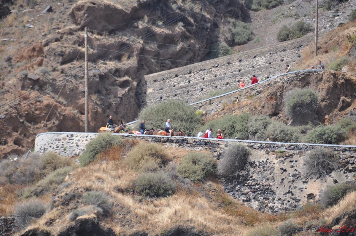 We arrived in the caldera of Santorini early in the morning. While the day was sunny, there was an overcast and haze which remained most of the day. We did not schedule a tour - we wanted to explore on our own. After a nice breakfast in La Terraza we gathered our cameras and took the tender over to the island. There are three ways to go up the cliffs to the town of Fira - walk the path up for about 30 minutes of hard climbing (umm, nope); ride a donkey up the path (umm, not much better!); or pay 5 euros and ride the cable car up in about 5 minutes (Yep, that's our style!). Once we reached the town we wandered along the street facing the caldera and marveled at the view. We wish it had been a clearer day as the view is incredible. After a few pictures we wandered the streets, looked in shops, tried on some greek clothing, went into the Catholic Cathedral of Santorini. Although small, the mosaics are beautiful. We located a small coffee shop tucked down a cross street. Cappuccino Crema was on the menu so we gave it a try. It was the best cappuccino we ever tasted and ended up being number one on the "Cap List" as we ended up drinking cappucinos in nearly every port we stopped. Since the cafes and bars in most places have free WiFi we would take our Ipads with us and when it was time for a break we located a cafe and enjoyed a couple of cappuccinos and sometimes a small snack. We could check our email and surf the internet a bit which made it much easier once we returned home. We also were able to drop quick texts or emails to family as we traveled. I have the coffee shop marked on the map so when we return in 2015 - that is definately the place we will go for another Cappuccino Crema! We did not visit Oia, but we heard it is both beautiful and interesting. Santorini is also the site of Akrotiri - a Minoan settlement that has been excavated. So on our next cruise we will need to go see both places on the island! We returned to the ship around 4 pm and prepared for another hosted dinner, this time with Paulina Salinas, the shore concierge manager. Dinner was enjoyable and great conversation. We met several couples that evening who we conversed with a few times throughout the cruise. On to our next stop - Napflion and our tour to Mycenae!