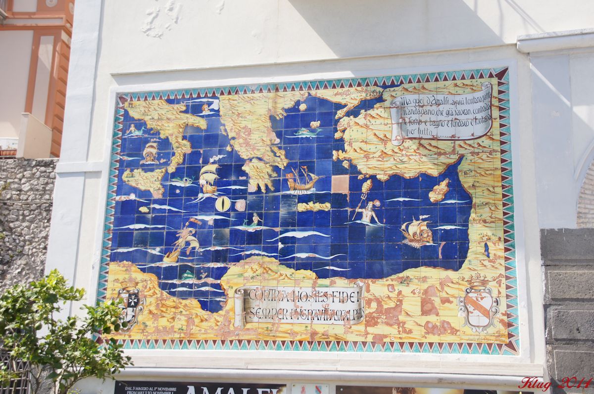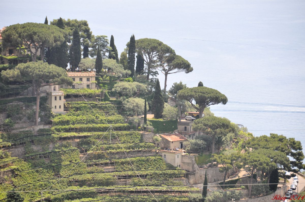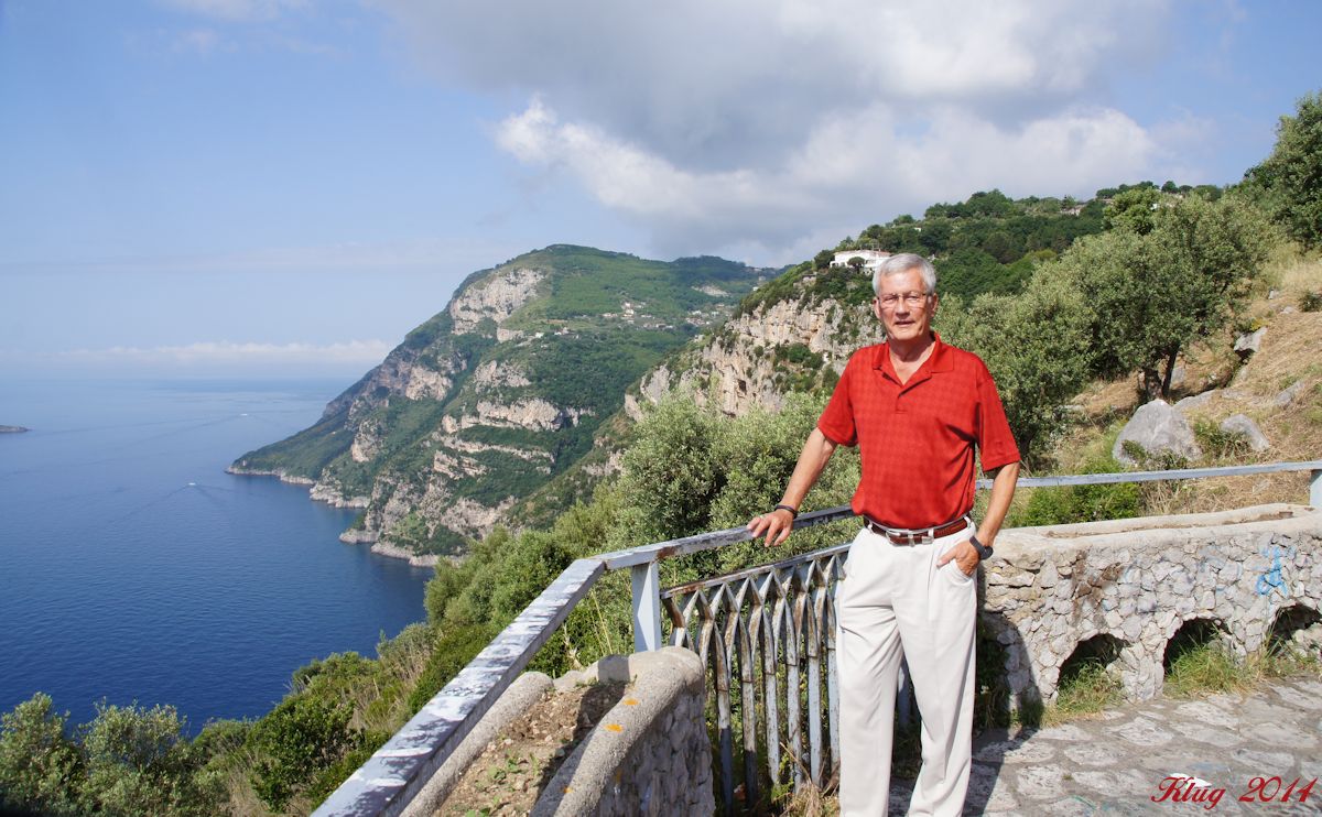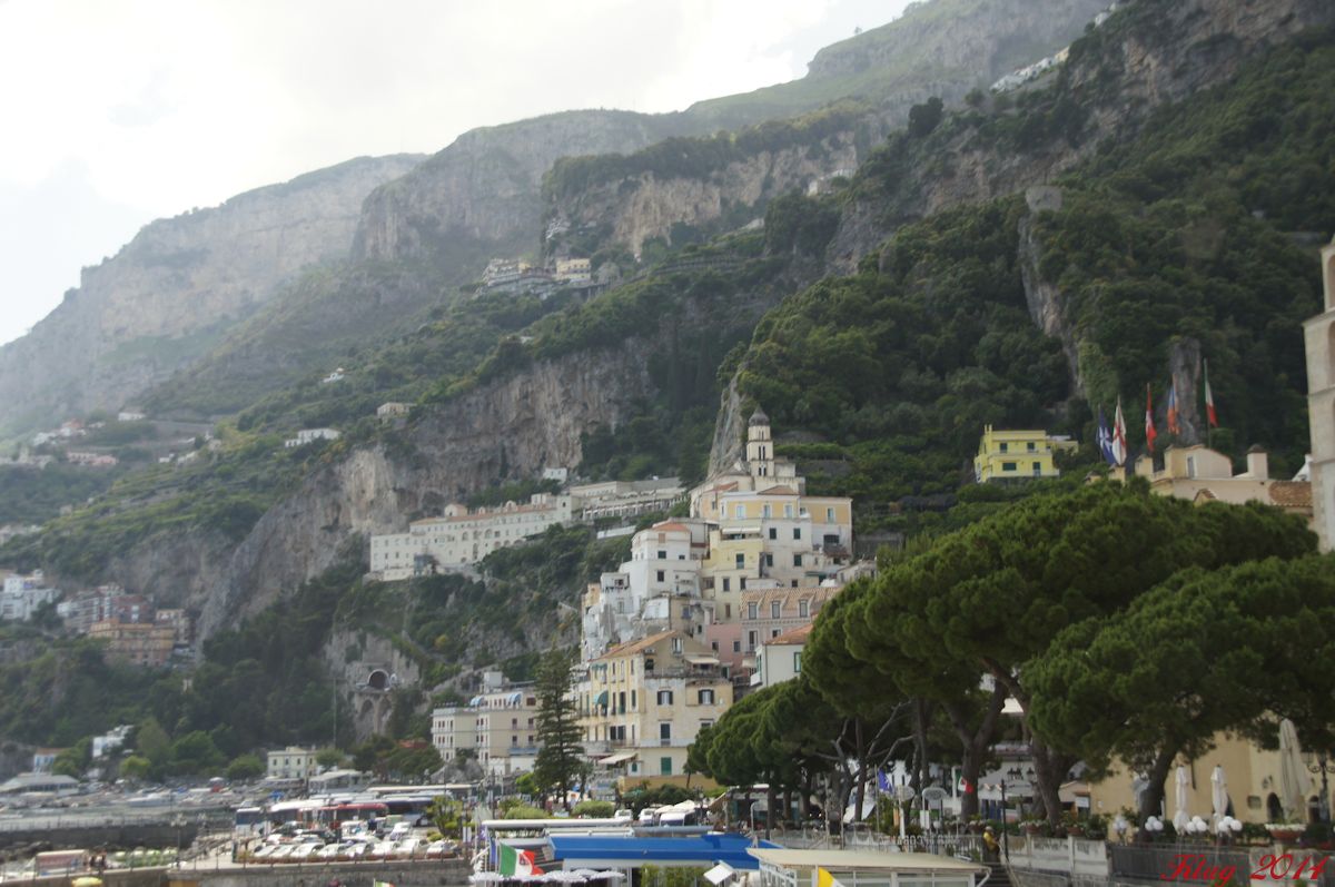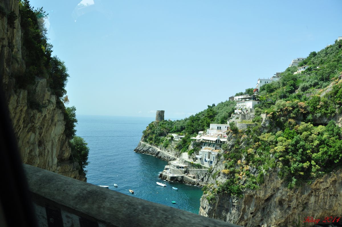 Our first stop was in Positano, a beautiful place on the coast. The town is built on incredible steep grades of the side of the coast and requires strong legs for walking. We wandered through the town, enjoyed a cappuccino at a small shop and picked up a few souvenirs. On the way to Ravello we stopped in a little town called Pontone for lunch. The restaurant the driver took us to was Ristorante and Pizzeria S. Giovanni with a view overlooking the coast. So we ordered pizza, of course, and enjoyed some wine and shared several varieties. Next stop was Ravello. We wish we had taken more pictures there as Ravello is a very pretty place. We spent our time looking through the pottery shops and found an exquisite bowl with lemons. Some thought and discussion and we decided to get it and have it shipped home. A few treasures for David and Lynn and we were back on the road to Amalfi.