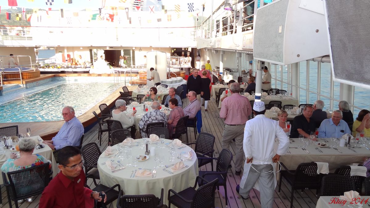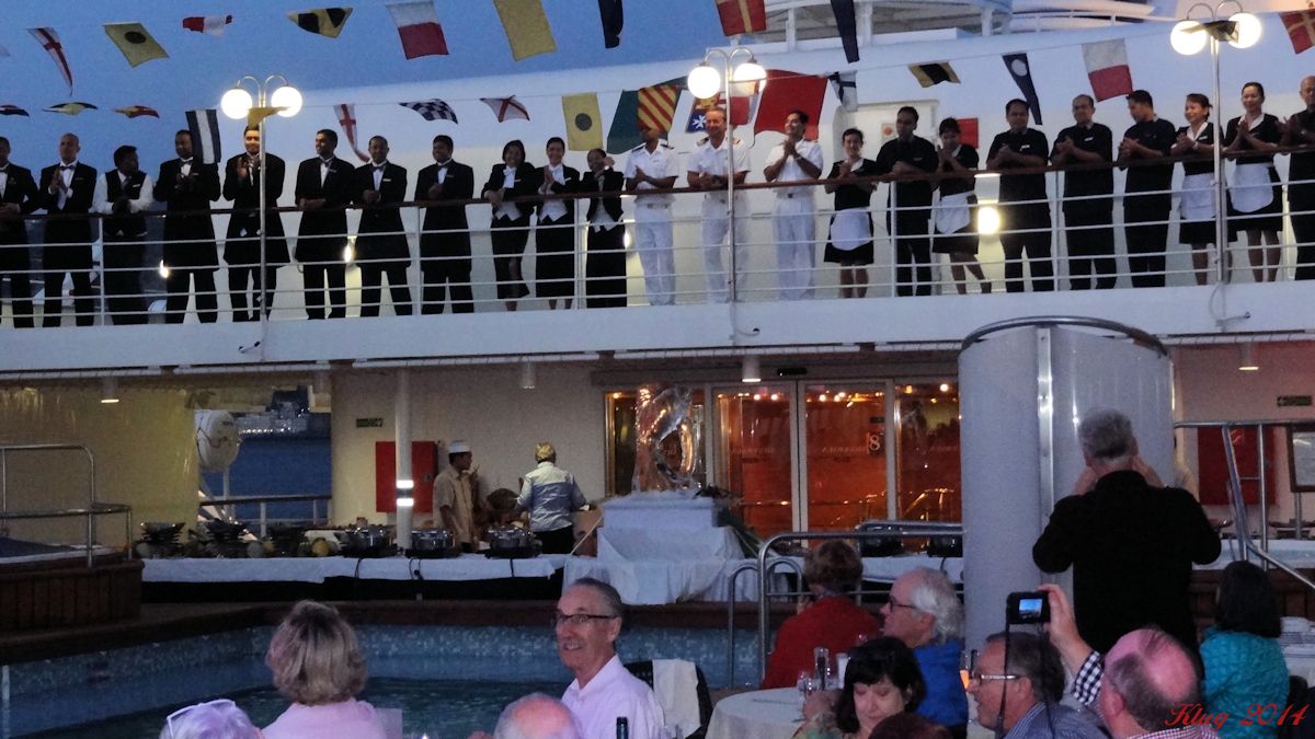 That evening was the "Dinner Under the Stars" on the pool deck, or as most call it "The BBQ"! BBQ on Silversea does not mean just ribs and chicken, but rather lobster tails, shrimp, and other wonders are also available. It's also crystal glasses and china! But still a very relaxed atmosphere. We enjoyed a wonderful dinner and then the Captain recognized the crew and staff with some awards and kind of a "farewell" as we would be disembarking in two days.