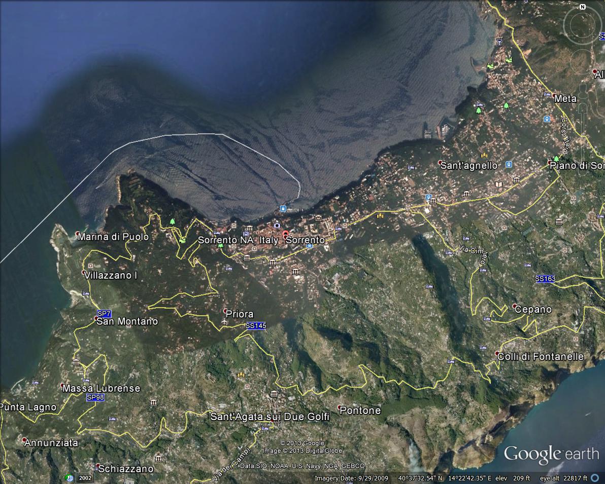 Sorrento (Neapolitan: Surriento) is a small town in Campania, southern Italy, with some 16,500 inhabitants. It is a popular tourist destination which can be reached easily from Naples and Pompeii, as it lies at the south-eastern end of the Circumvesuviana rail line. The town overlooks the Bay of Naples as the key place of the Sorrentine Peninsula, and many viewpoints allow sight of Naples itself, Vesuvius and the Isle of Capri.